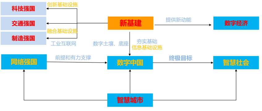 黨的十九大報告中提出“要建設(shè)科技強國、質(zhì)量強國、航天強國、網(wǎng)絡(luò)強國、交通強國、數(shù)字中國和智慧社會”的國家戰(zhàn)略。新基建以數(shù)字化為核心,對傳統(tǒng)基礎(chǔ)設(shè)施進行數(shù)字化、智能化改造,實現(xiàn)傳統(tǒng)基礎(chǔ)設(shè)施轉(zhuǎn)型升級,滿足智能時代發(fā)展對基礎(chǔ)設(shè)施的要求,與“數(shù)字中國”戰(zhàn)略一脈相承,為數(shù)字中國發(fā)展補齊短板。